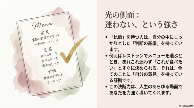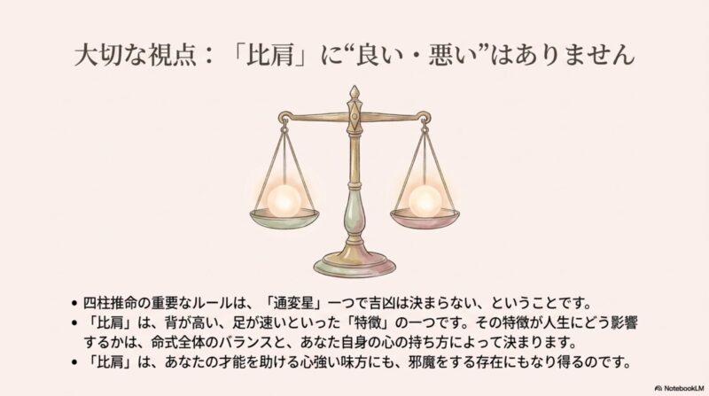 比肩自体には善悪や吉凶の判断は存在せず「命式の構成要素」を示す記号のような存在です。