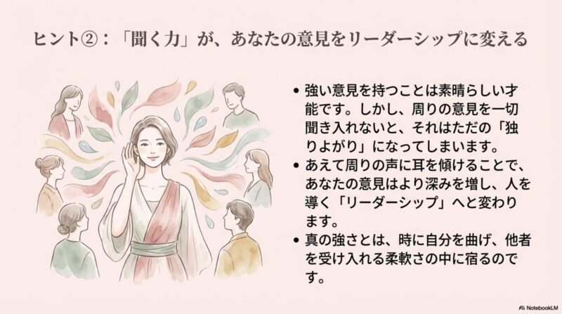 悪い面を見せれば自己主張が強すぎて周りから浮いてしまう、周りの意見を無視して自分の意見を
