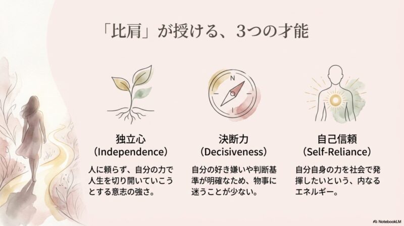 - 比肩の性格的特徴は、独立心・自我・競争心の強さとして表れることがある
