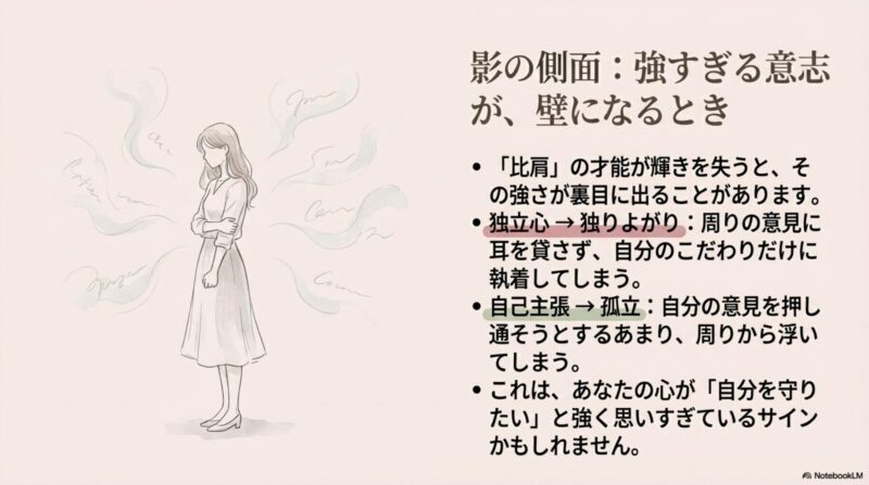 もともと強い日干に比肩が重なると過剰な自我や孤立を生む可能性があります