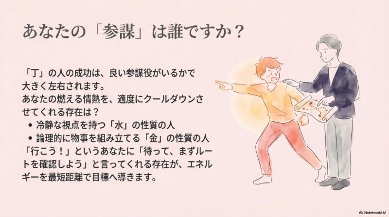 - 参謀の存在が不可欠: この素晴らしい行動力が真価を発揮するためには、必ず冷静な視点から助言をくれる良い参謀の存在が不可欠です。最高の丁火の人は思いつきで突っ走るのではありません。