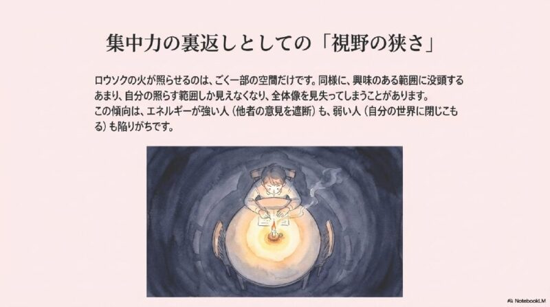 ろうそくの火が照らせる範囲はごく一部の空間だけです。この性質が行き過ぎると自分の興味がある範囲しか見えなくなってしまう視野の狭さにつながります。