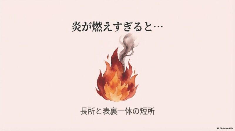 - 結果: これらが多すぎると火は制御不能なほど燃え上がり、自分を客観視して失敗を冷静に分析したりする自己冷却機能が働かなくなります。自分は正しいという思い込みが強くなり、成長の機会である反省を失ってしまうのです。