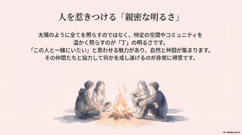 丁日干は焚き火や灯火のように、条件が整って初めて輝く繊細なエネルギーです。