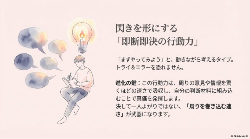 - 参謀を味方につける: 最高の武器である行動力を的確な一手に変えるために冷静な助言者を常にそばに置くか内省の習慣を持つこと。