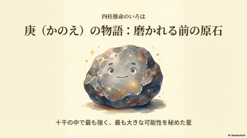 庚(かのえ)という星はまさに鉱山から掘り出されたばかりの巨大な鉄の塊(原石)に例えられます。身旺の庚は十干の中で最も強くて剛直であり、どんな困難にも屈しない力を秘めています。