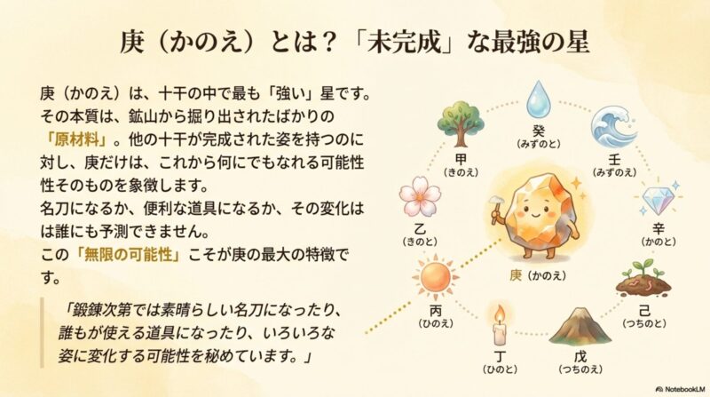 庚は十干最強の星、磨けば名刀、放置すれば鉄屑という極端な可能性を秘めている。