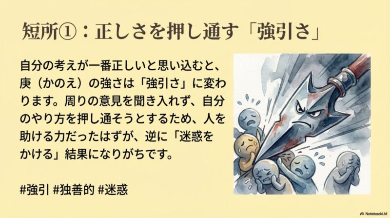 • 【詳説】 庚は一度これが正義だと思い込むと柔軟性を欠いた強情さに変わる性質(金気の過剰)があります。攻撃性が内側に向かえば自己否定に外側に向かえば他者への冷酷な批判となり、周囲に人がいなくなる孤独な刃になってしまいます。
