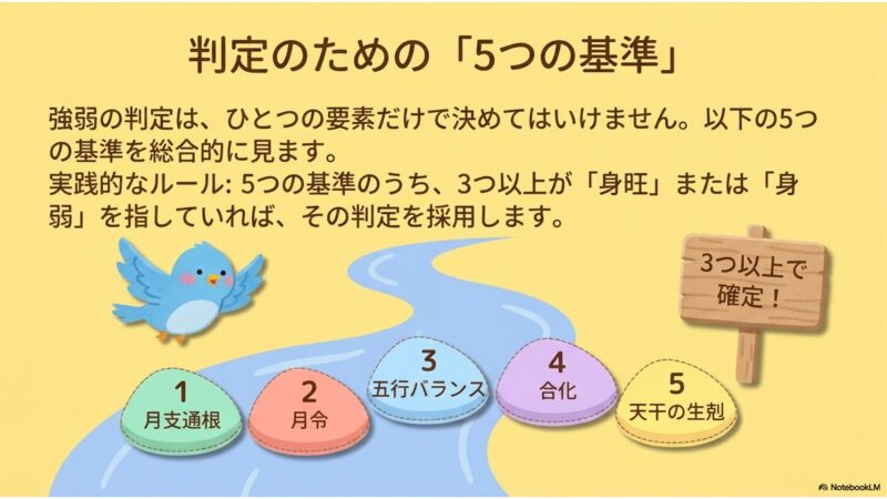 身旺・身弱の判定には以下の5つの基準を総合的に見ます。ひとつだけで決めるのではなく5つの基準のうち3つ以上が身旺(または身弱)を指していればその判定を採用するのが実践的なやり方です。