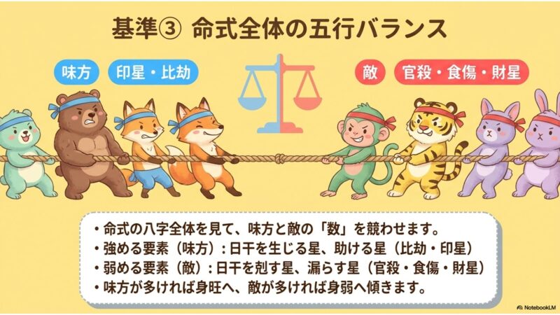 比劫+印星の数≧官殺+食傷+財星の数バランス