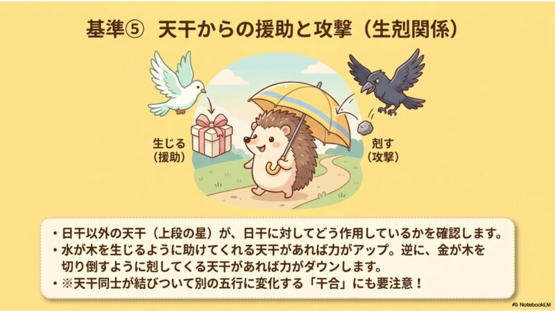 天干同士の生剋関係も確認します。たとえば日干が甲(木)で他の天干に壬(水)や癸(水)があれば水が木を生じるため日干を助けます。逆に庚(金)や辛(金)があれば金が木を剋すため日干を弱めます。