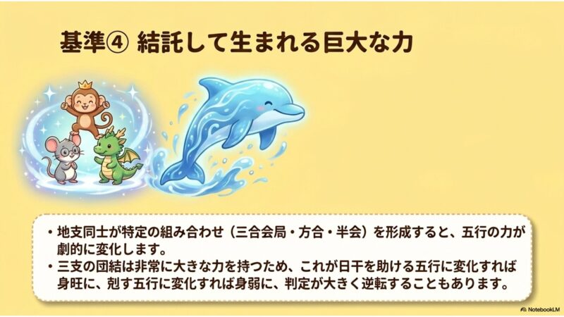 4.三合・方合:地支の合が日干を助けるか弱めるか※ただし支合は考慮せず