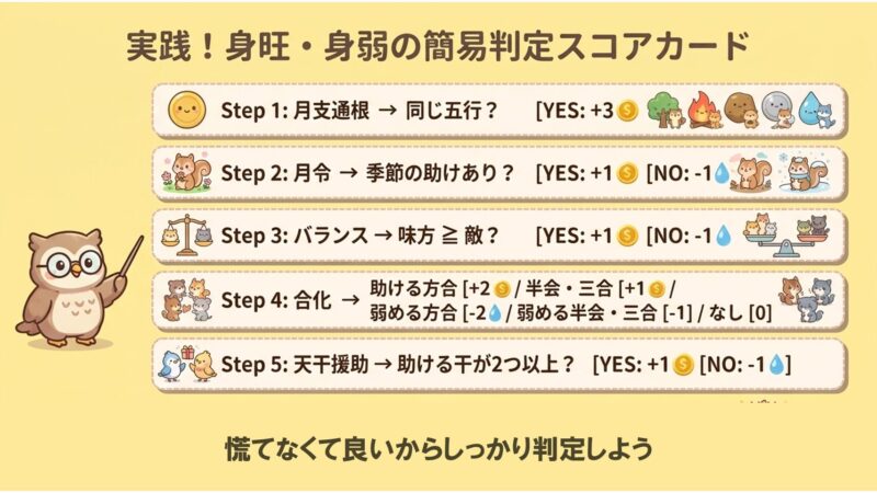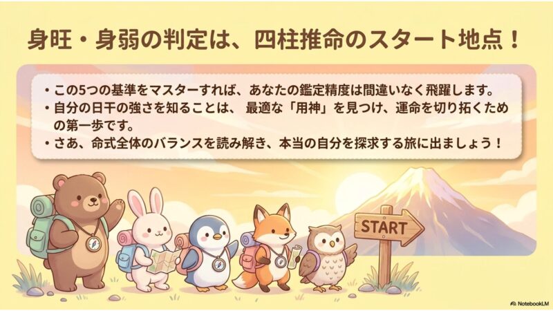身旺・身弱の判定は四柱推命の鑑定において最も基本的で最も重要なステップです。この記事で紹介した5つの判定基準をもう一度整理します。