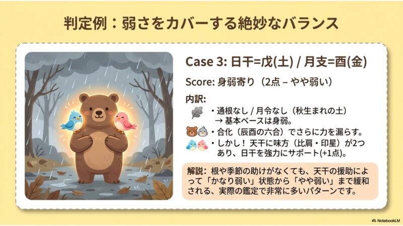 ・ステップ5(天干の援助):戊(比肩)・丙(印星)の2つが日干を助ける→身旺+1