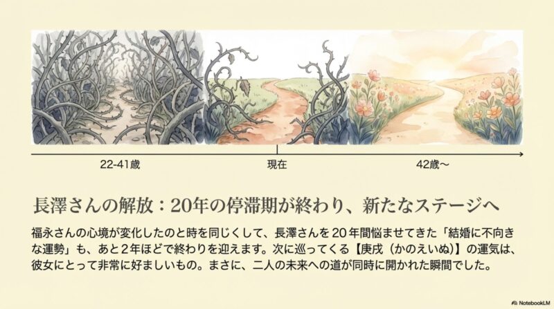 22歳から続いていた結婚を邪魔する運勢という長いトンネルを抜けてちょうど運気が切り替わる直前という絶好のタイミングで最高の縁を掴み取った。 - 孤高の天才・福永監督を動かした心境の変化
