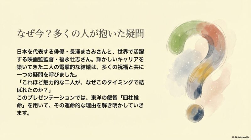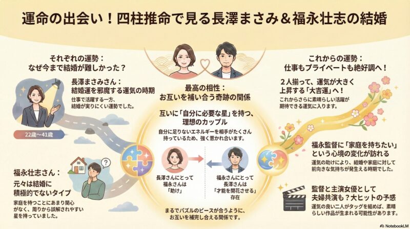 俳優・長澤まさみさんとニューヨークを拠点に活躍する映画監督・福永壮志さんの結婚、このニュースは多くの人々に祝福と共に大きな驚きをもって伝えられました。二人がこれまで歩んできた道のりを四柱推命で読み解く者にとってありえないはずの出会いに思えたからです。