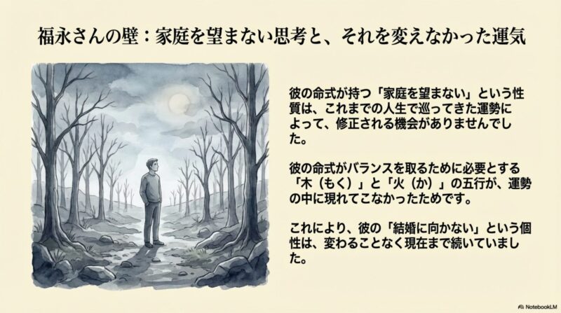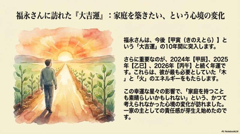 2024年からの甲辰・乙巳そして丙午といった年運が彼の背中を力強く押しました。これらの干支は家庭を持つのも良いものかもしれない一家の主としての責任を背負ってみたいという具体的で前向きな思考の変化を促す絶大な力を持っていたのです。