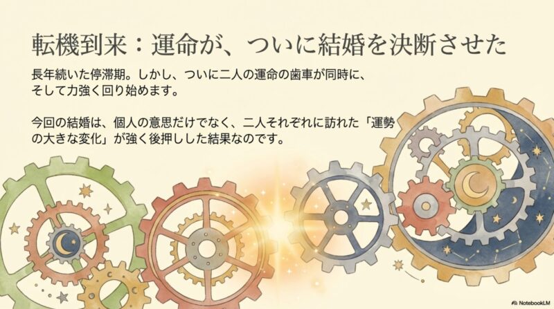彼の心を結婚へと動かしたのは未来と現在から寄せ来る二つの強力な運気の波でした。