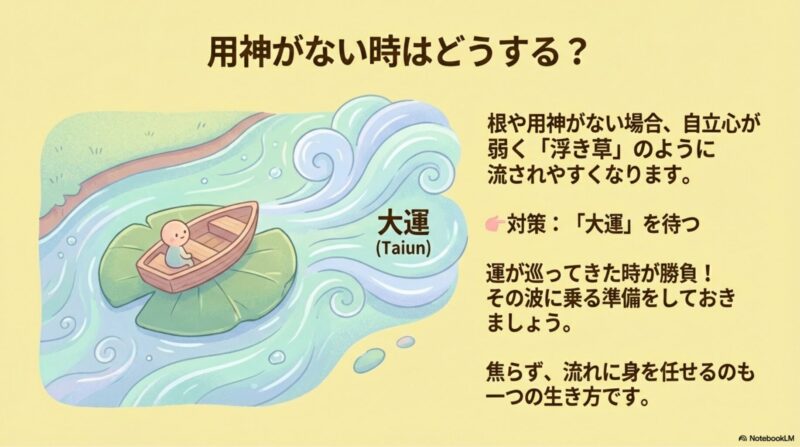 命式に用神(通根)がない人は良くも悪くも流れに身を任せる性質を持っています。