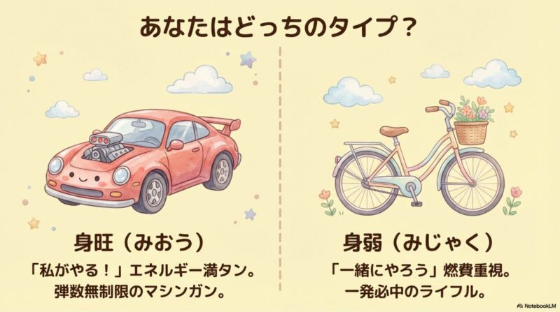 まずあなたが身旺(エネルギー過多)なのか身弱(エネルギー不足)なのかを確認します。これがすべての基礎となります。