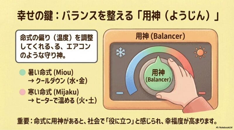 例えばとてもエネルギッシュで行動力がある人は暑すぎる部屋のような状態です。この場合そのエネルギーを上手に発散させる冷房のような働きをする要素が用神となります。逆にエネルギーが不足しがちで疲れやすい人にはエネルギーを補給してくれる暖房のような要素が用神になります。