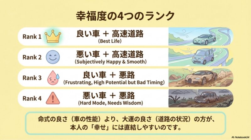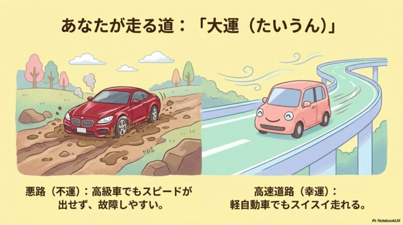 中古の軽自動車(それほど恵まれていない命式)でもよく整備された高速道路(良い大運)を走れるなら旅は快適です。大きな成功はないかもしれませんが安心して前に進むことができます。