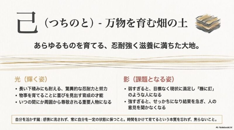 己(つちのと)は作物を育む「畑の土」のように忍耐強くコツコツと何かを育てるのが得意です。でもその辛抱強さは明確な目標がない場合に忍耐強いが行動出来ない人という短所に変わってしまいます。
