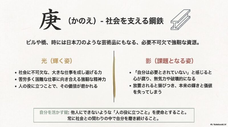 例えば鉄鉱石である庚(かのえ)が自分の本質は社会を良くするダイナミックな力だと知っていれば、一時的に評価されなくても自分を見失わずにいられるはずです。