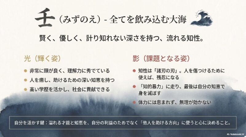 例えば、海である壬(みずのえ)は大きな知恵を持ちますが、その使い道を誤ると知的暴力となって、自らの知恵で身を滅ぼすことさえあるのです。