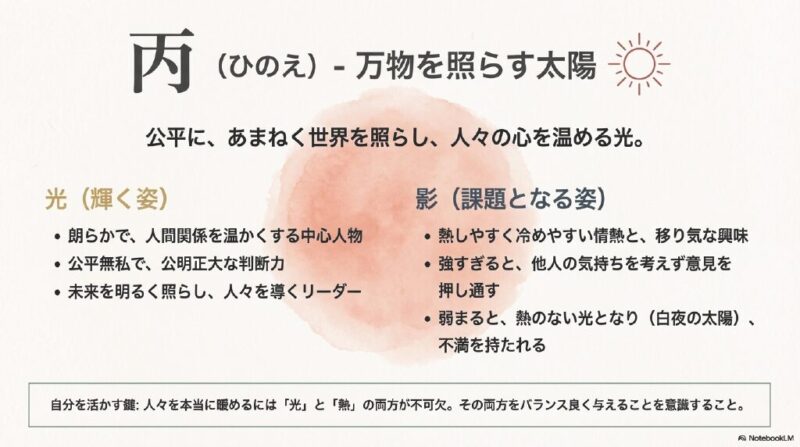 太陽である丙(ひのえ)も力が強すぎればリーダーシップが押し付けや傲慢という短所に変わり、弱すぎれば影響力はあっても人を動かす熱意のない光になってしまいます。