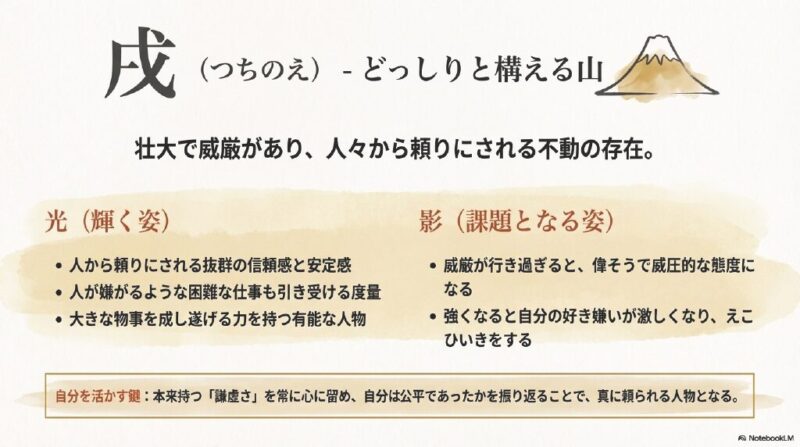 それは知ることで対処が可能だと例えば山である戊(つちのえ)は放っておくと頑固になりがちですが、その性質を自覚して「公平であっただろうか?」と内省する力を持つことで運命の力学に流されず主体的にバランスを取ることができるのです。