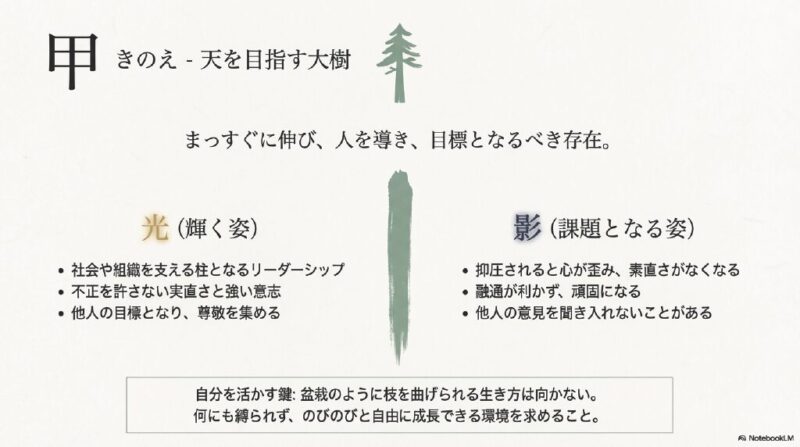 甲(きのえ)は天にまっすぐ伸びる大樹に象徴される性質です。その本質はのびのびと自由な環境でこそ最大限に発揮されます。我慢を強いられる生き方はこのタイプには向いていません。