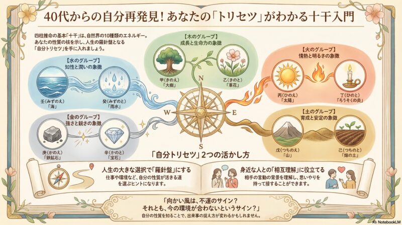 中核にあるのが十干(じゅっかん)という考え方です。これは、私たちの生まれ持った性質を自然界の10種類の要素になぞらえて理解する理論です。この記事では、この十干の知識を、自分自身の取扱説明書を手に入れるための鍵として紹介します。